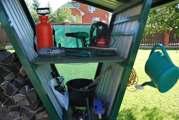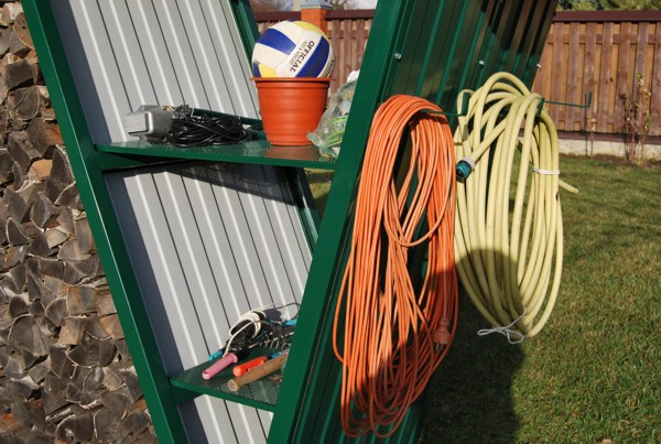Ответ: удобнее в эксплуатации. Чтобы пользоваться инвентарем не требуется входить и выходить, соответственно не надо заботиться об уборке полов. Поскольку весь инвентарь надежно укрыт от дождя и других осадков, но одновременно находится под вашим взглядом, то не требуется время для поиска нужной вещи, она всегда под рукой. Благодаря секторам и подвесам для каждой вещи определено свое собственное место. Ходить и искать нужную вещь вам уже никогда не придется.