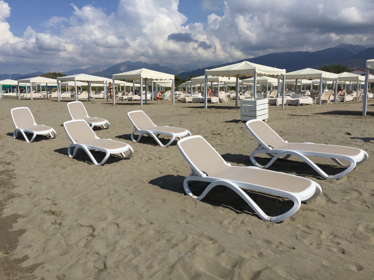 Для размещения на этом пляже, расположенном на берегу песчаного пляжа, было решено выбрать несколько вариантов шезлонгов.